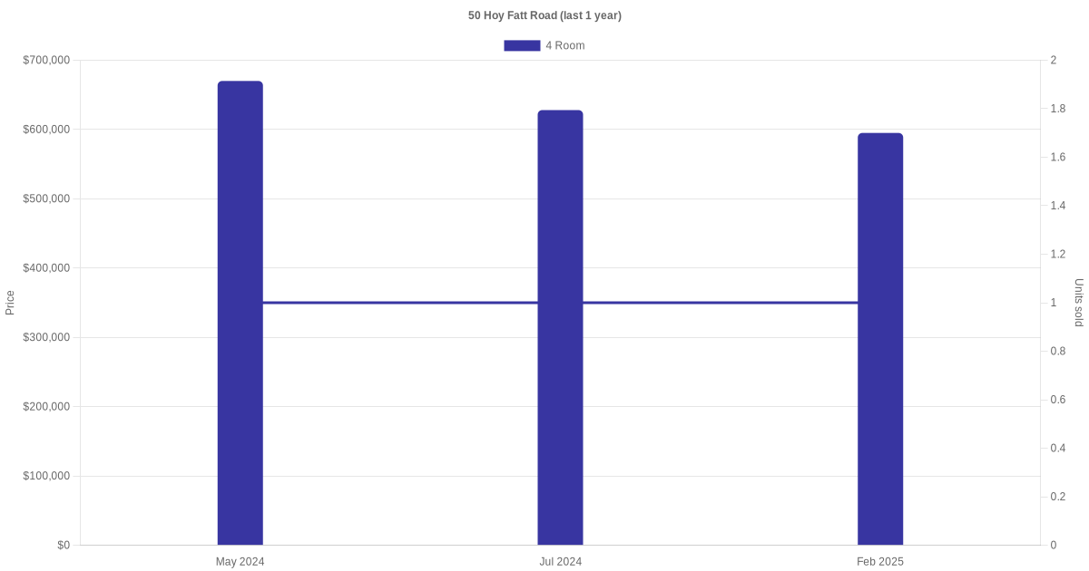 | Jul 2025 | $650,000 | $7,738 | 4 Room | Blk 50 Hoy Fatt Road 4 Room / 84 sqm | 10 to 12 | 84 sqm | Simplified | 1987 |