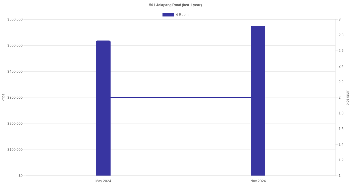 Below is a quick summary of the resale transactions volume and average price trends for the 4 room and 5 room units at 501 Jelapang Road.