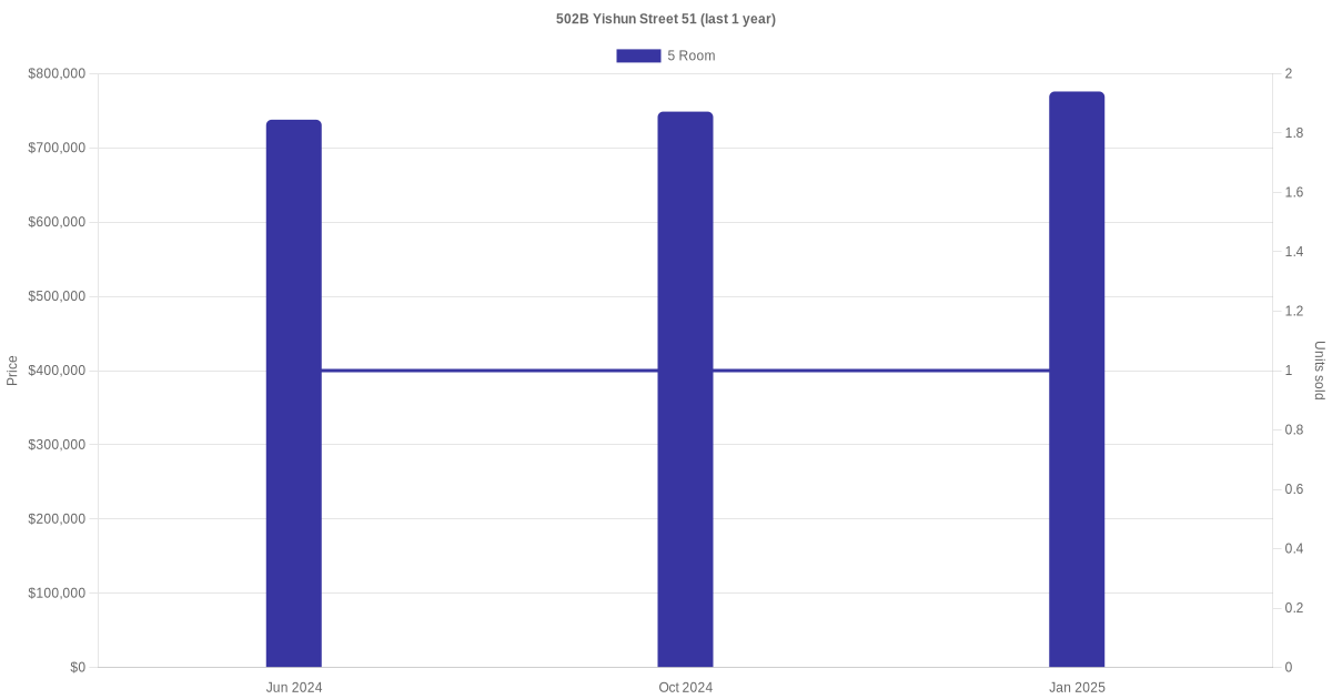 Below is a quick summary of the resale transactions volume and average price trends for the 4 room and 5 room units at 502B Yishun Street 51.