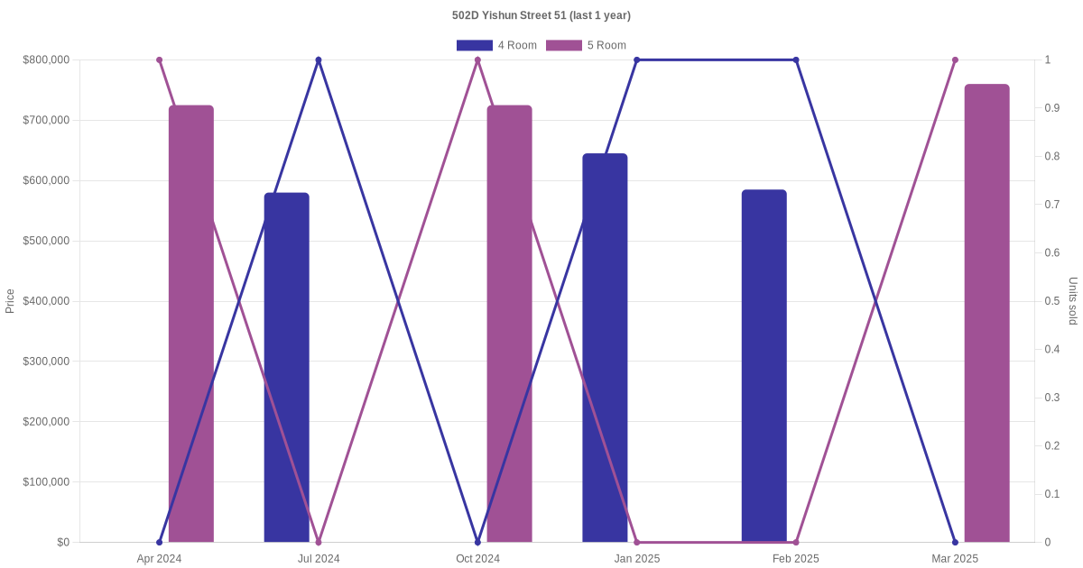 Below is a quick summary of the resale transactions volume and average price trends for the 4 room and 5 room units at 502D Yishun Street 51.