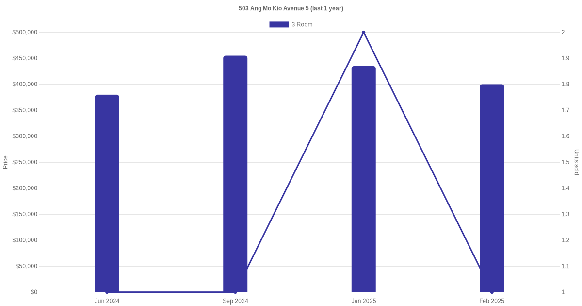Below is a quick summary of the resale transactions volume and average price trends for the 3 room and 5 room units at 503 Ang Mo Kio Avenue 5.