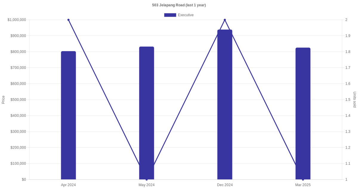 Below is a quick summary of the resale transactions volume and average price trends for the executive units at 503 Jelapang Road.
