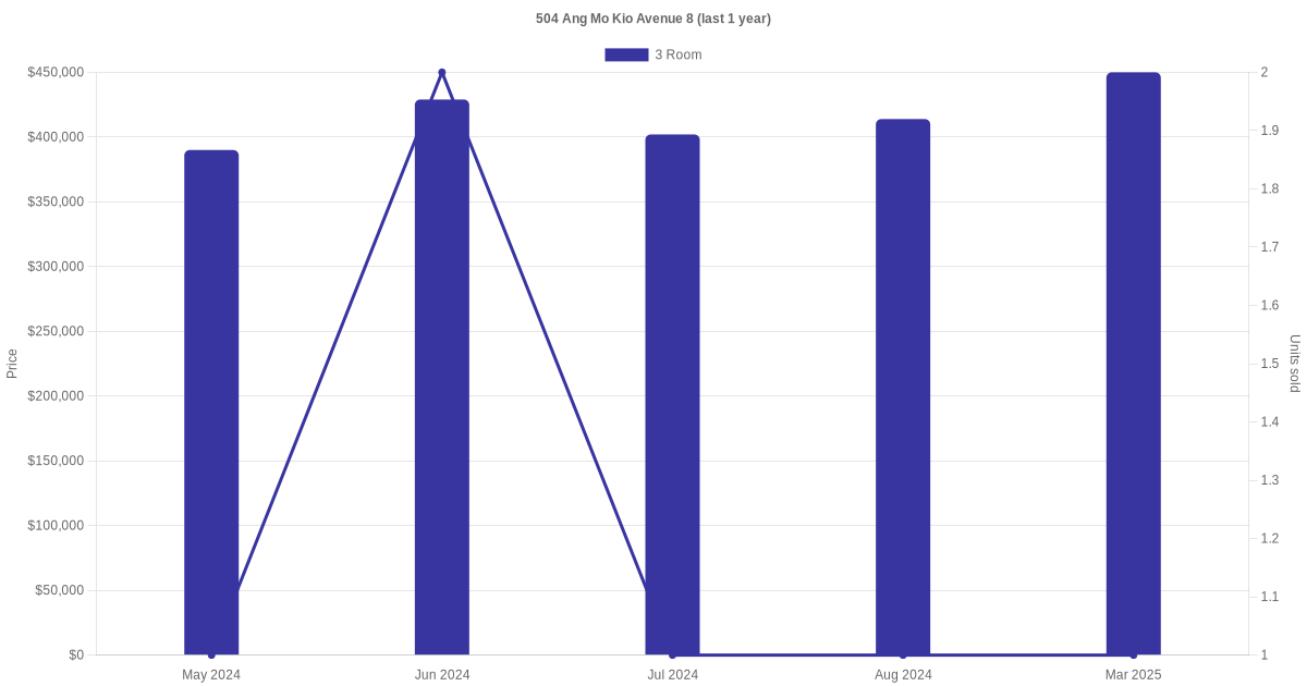 | Apr 2025 | $2,500 | 3 Room | Blk 504 Ang Mo Kio Avenue 8 3 Room | Ang Mo Kio |