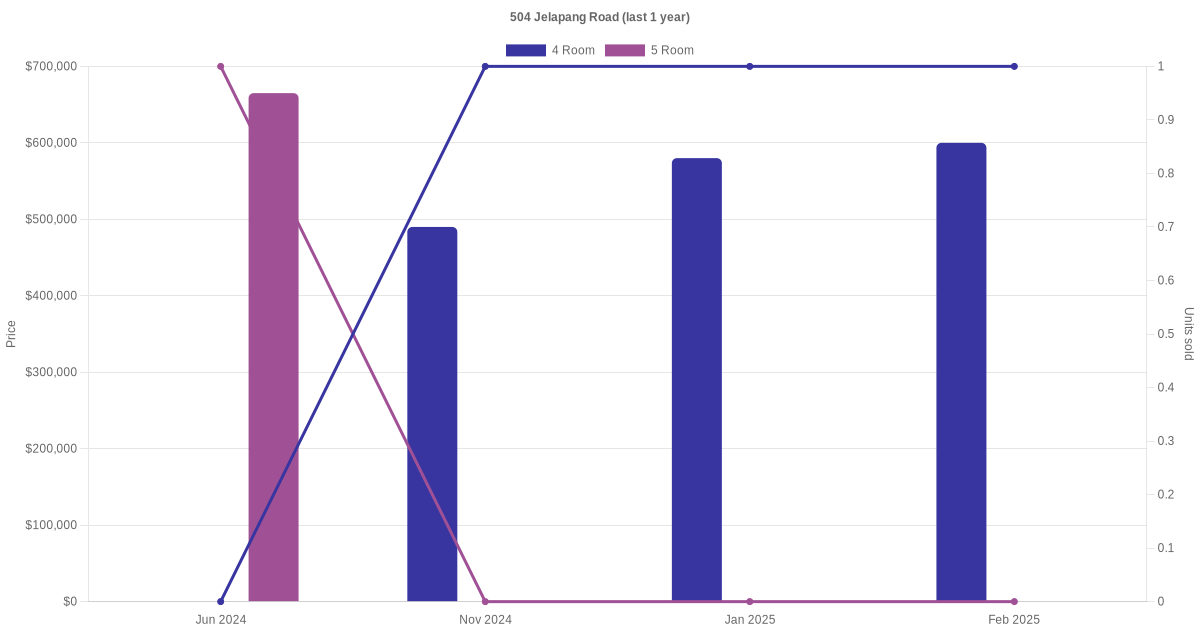 Below is a quick summary of the resale transactions volume and average price trends for the 4 room and 5 room units at 504 Jelapang Road.
