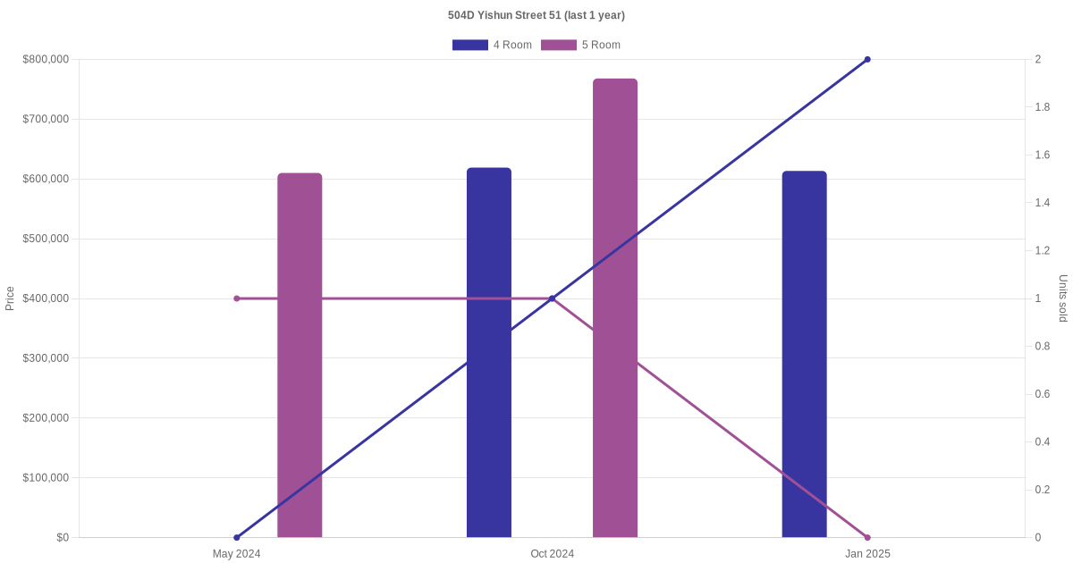 Below is a quick summary of the resale transactions volume and average price trends for the 4 room and 5 room units at 504D Yishun Street 51.