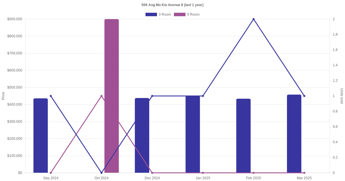 Below is a quick summary of the resale transactions volume and average price trends for the 3 room and 5 room units at 506 Ang Mo Kio Avenue 8.