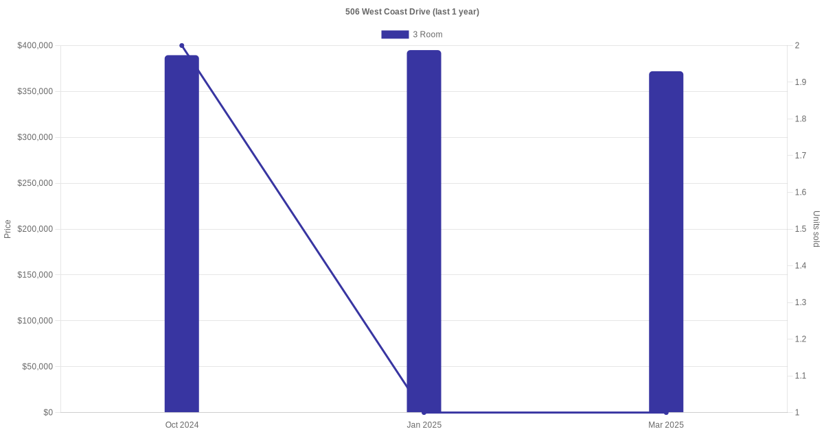 Below is a quick summary of the resale transactions volume and average price trends for the 3 room units at 506 West Coast Drive.