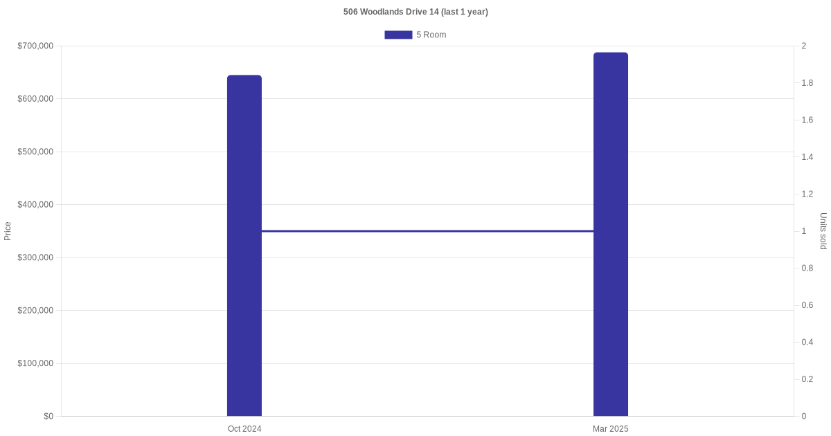 There were a total of 7 resale transactions in the last 3 years for units in block 506 Woodlands Drive 14, with the latest one recorded in Mar 2025.