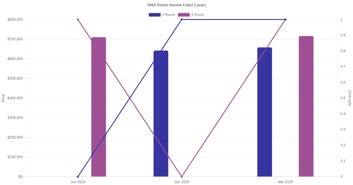 Below is a quick summary of the resale transactions volume and average price trends for the 4 room and 5 room units at 506A Yishun Avenue 4.