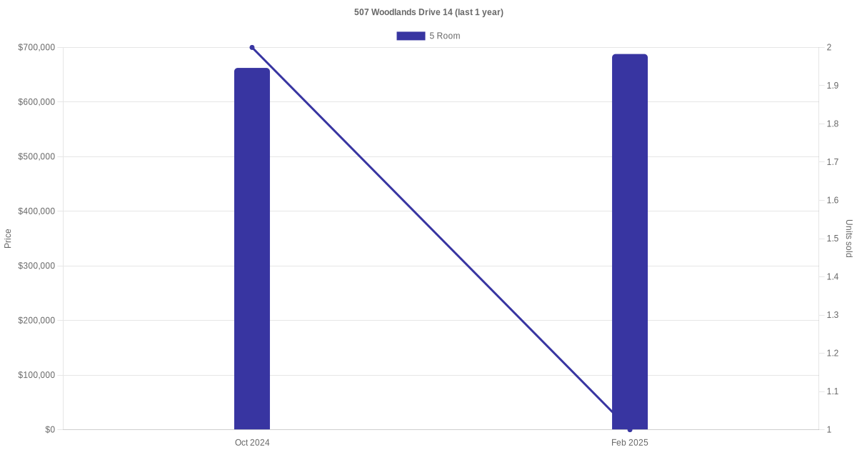 Below is a quick summary of the resale transactions volume and average price trends for the 4 room and 5 room units at 507 Woodlands Drive 14.