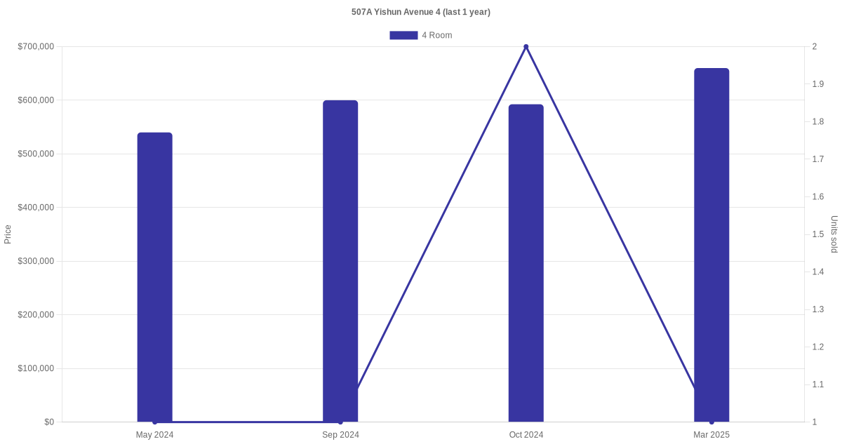 Below is a quick summary of the resale transactions volume and average price trends for the 3 room and 4 room units at 507A Yishun Avenue 4.