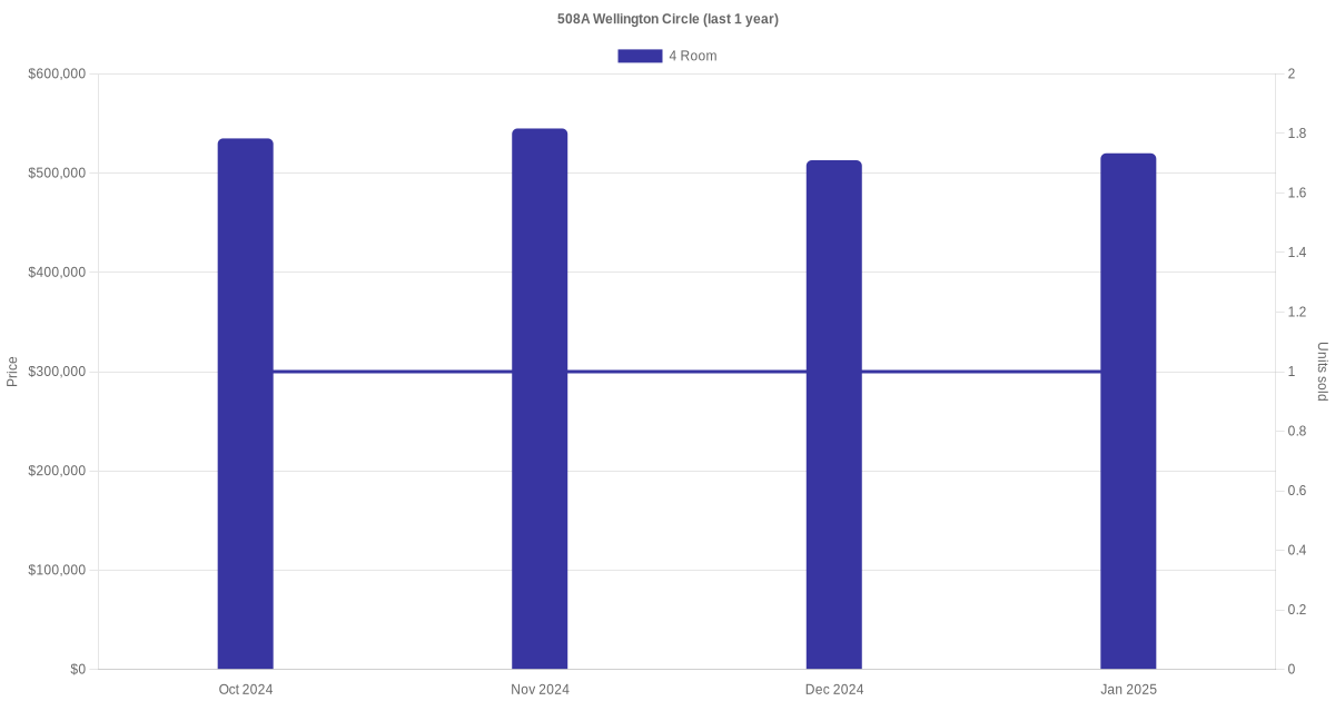 Below is a quick summary of the resale transactions volume and average price trends for the 4 room units at 508A Wellington Circle.