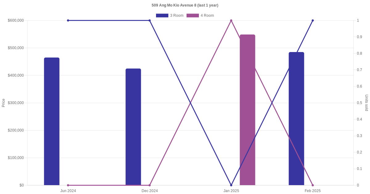 Below is a quick summary of the resale transactions volume and average price trends for the 3 room and 4 room units at 509 Ang Mo Kio Avenue 8.