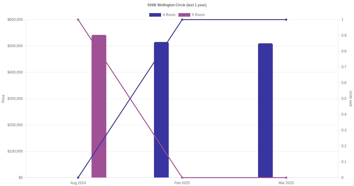 Below is a quick summary of the resale transactions volume and average price trends for the 4 room and 5 room units at 509B Wellington Circle.