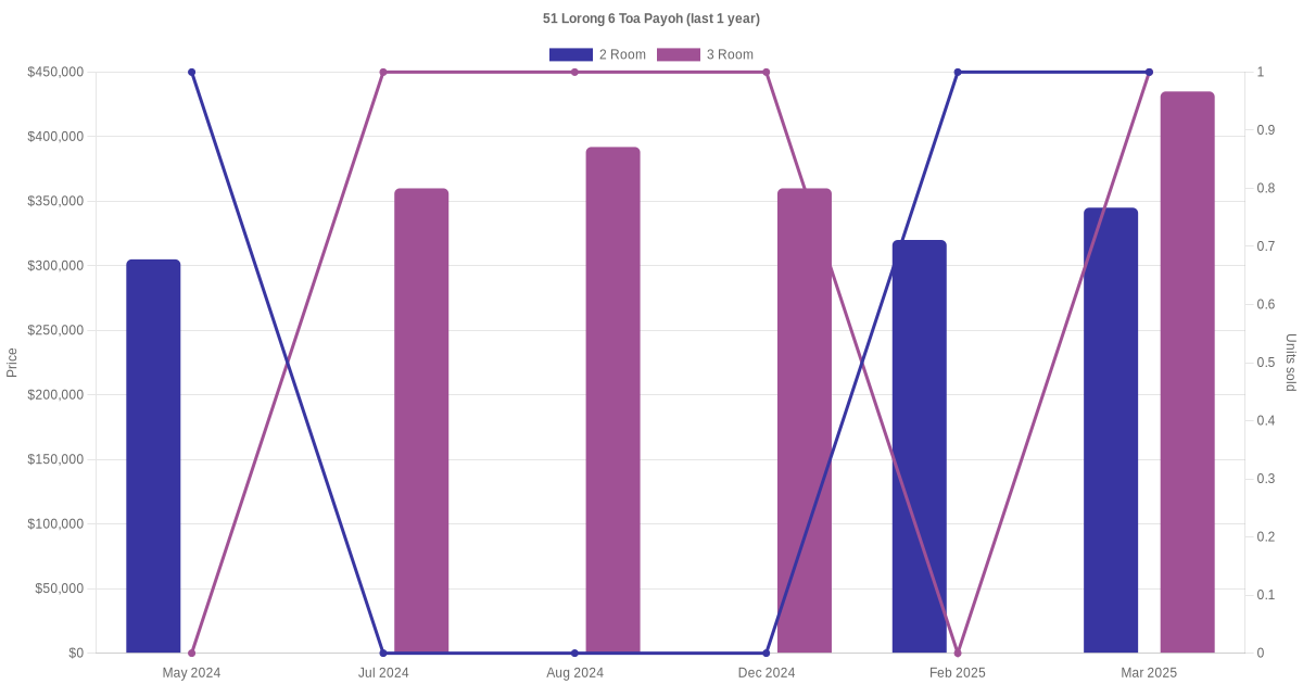 | Apr 2024 | $2,500 | 2 Room | Blk 51 Lorong 6 Toa Payoh 2 Room | Toa Payoh |
