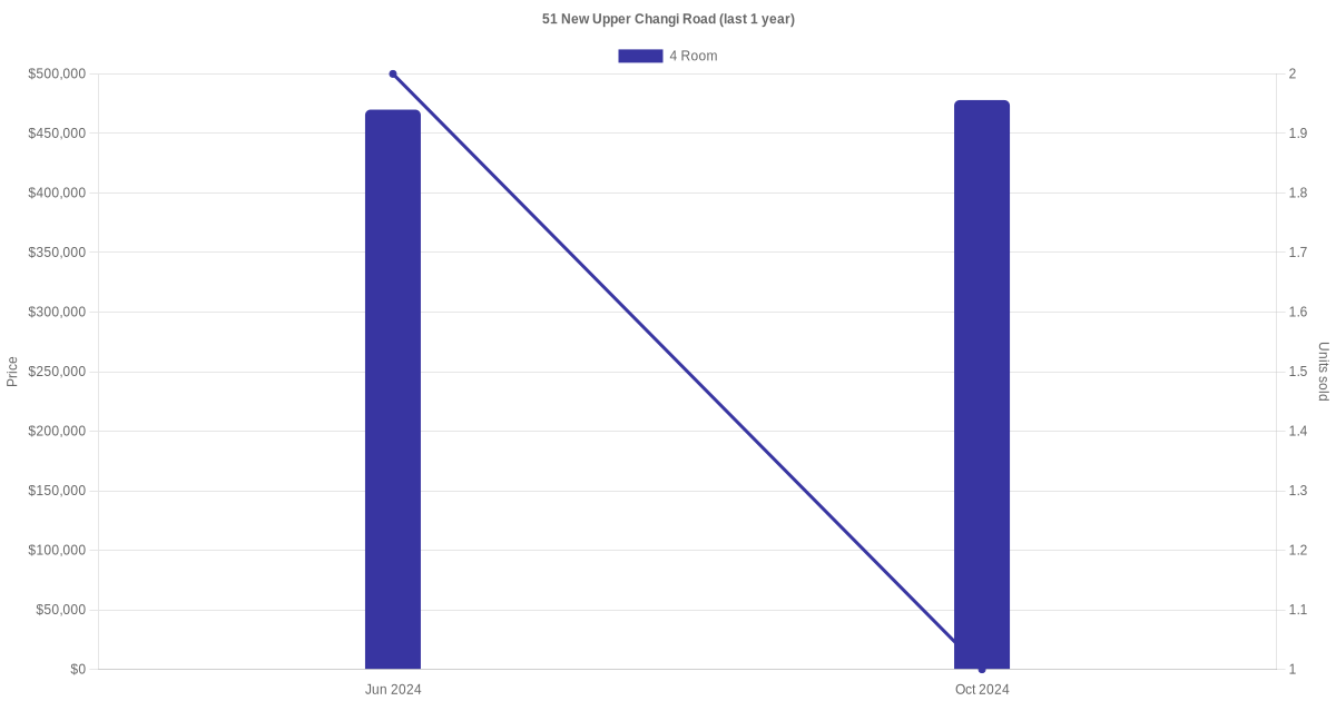 Below is a quick summary of the resale transactions volume and average price trends for the 4 room units at 51 New Upper Changi Road.