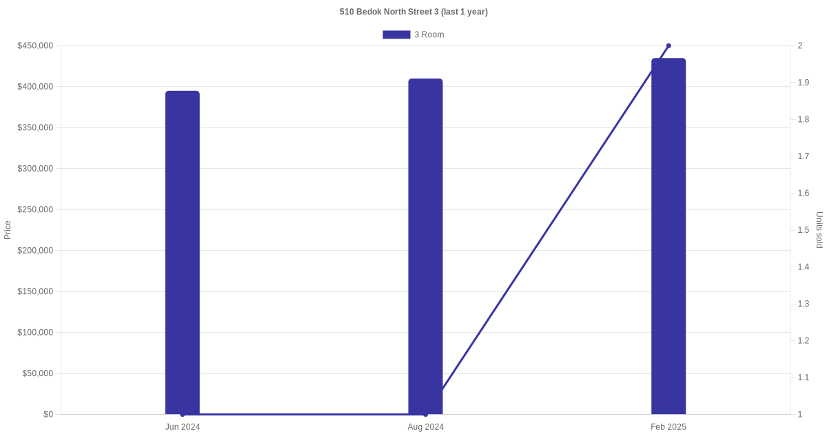 Below is a quick summary of the resale transactions volume and average price trends for the 3 room and 4 room units at 510 Bedok North Street 3.