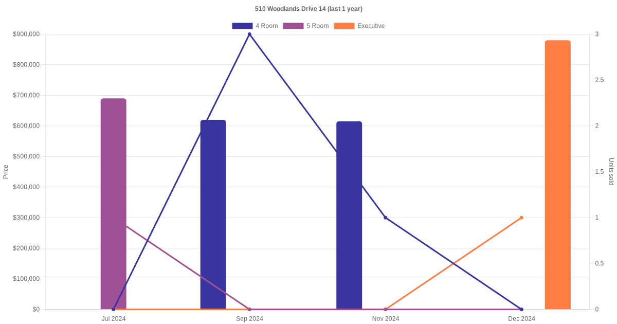 There were a total of 14 resale transactions in the last 3 years for units in block 510 Woodlands Drive 14, with the latest one recorded in Dec 2025.