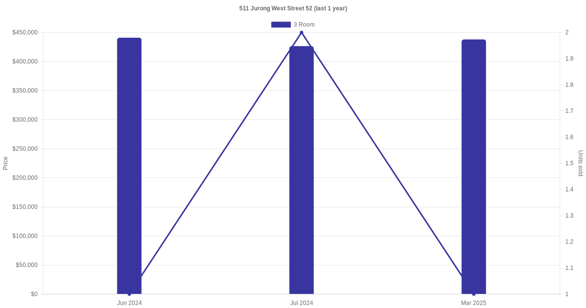 | Jul 2025 | $3,000 | 3 Room | Blk 511 Jurong West Street 52 3 Room | Jurong West |