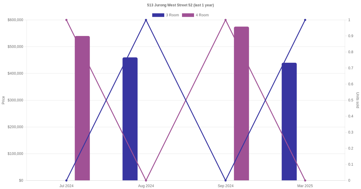 There were a total of 12 resale transactions in the last 3 years for units in block 513 Jurong West Street 52, with the latest one recorded in Jul 2025.