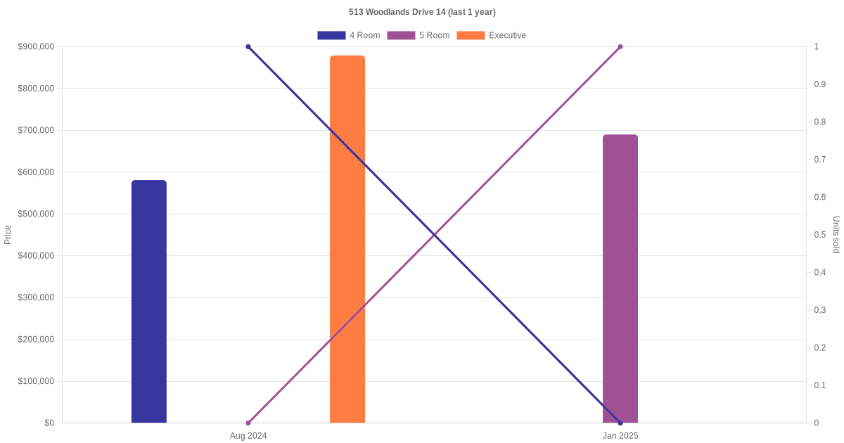 Here's a summary of the rental transactions and price trends for the 4 room, 5 room and executive units at 513 Woodlands Drive 14.