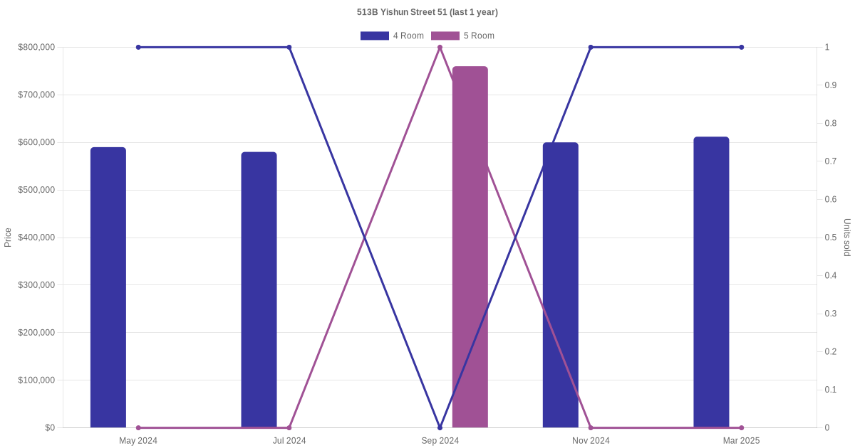 Below is a quick summary of the resale transactions volume and average price trends for the 4 room and 5 room units at 513B Yishun Street 51.
