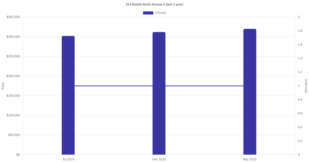 Below is a quick summary of the resale transactions volume and average price trends for the 2 room units at 514 Bedok North Avenue 2.
