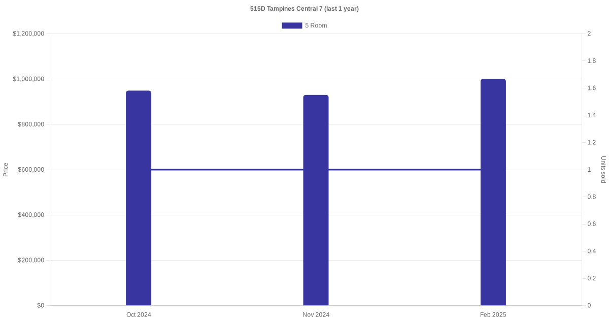 Below is a quick summary of the resale transactions volume and average price trends for the 5 room units at 515D Tampines Central 7.