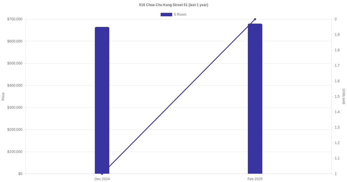 Below is a quick summary of the resale transactions volume and average price trends for the 4 room and 5 room units at 516 Choa Chu Kang Street 51.