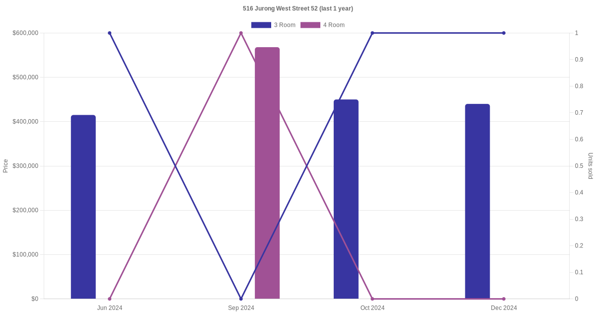 There were a total of 9 resale transactions in the last 3 years for units in block 516 Jurong West Street 52, with the latest one recorded in Dec 2024.