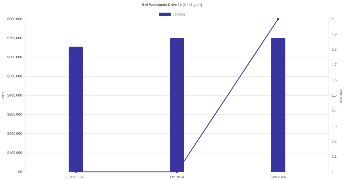 Below is a quick summary of the resale transactions volume and average price trends for the 4 room, 5 room and executive units at 516 Woodlands Drive 14.