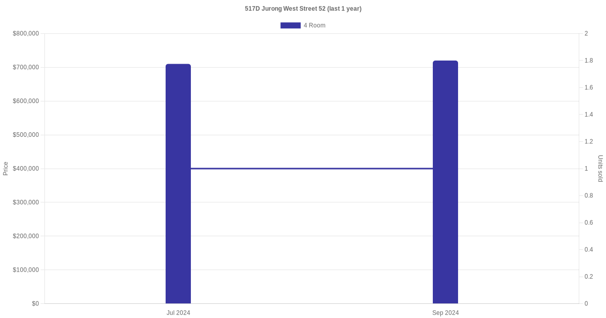 Below is a quick summary of the resale transactions volume and average price trends for the 4 room and 5 room units at 517D Jurong West Street 52.
