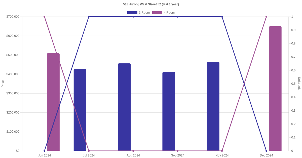Below is a quick summary of the resale transactions volume and average price trends for the 3 room and 4 room units at 518 Jurong West Street 52.