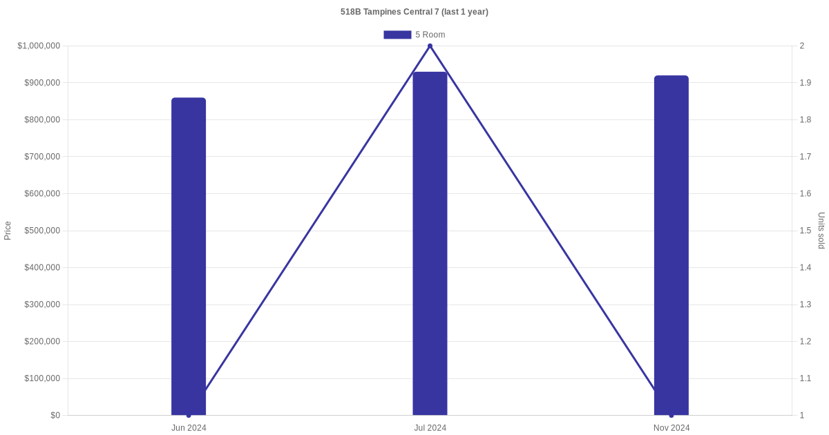 Below is a quick summary of the resale transactions volume and average price trends for the 5 room units at 518B Tampines Central 7.