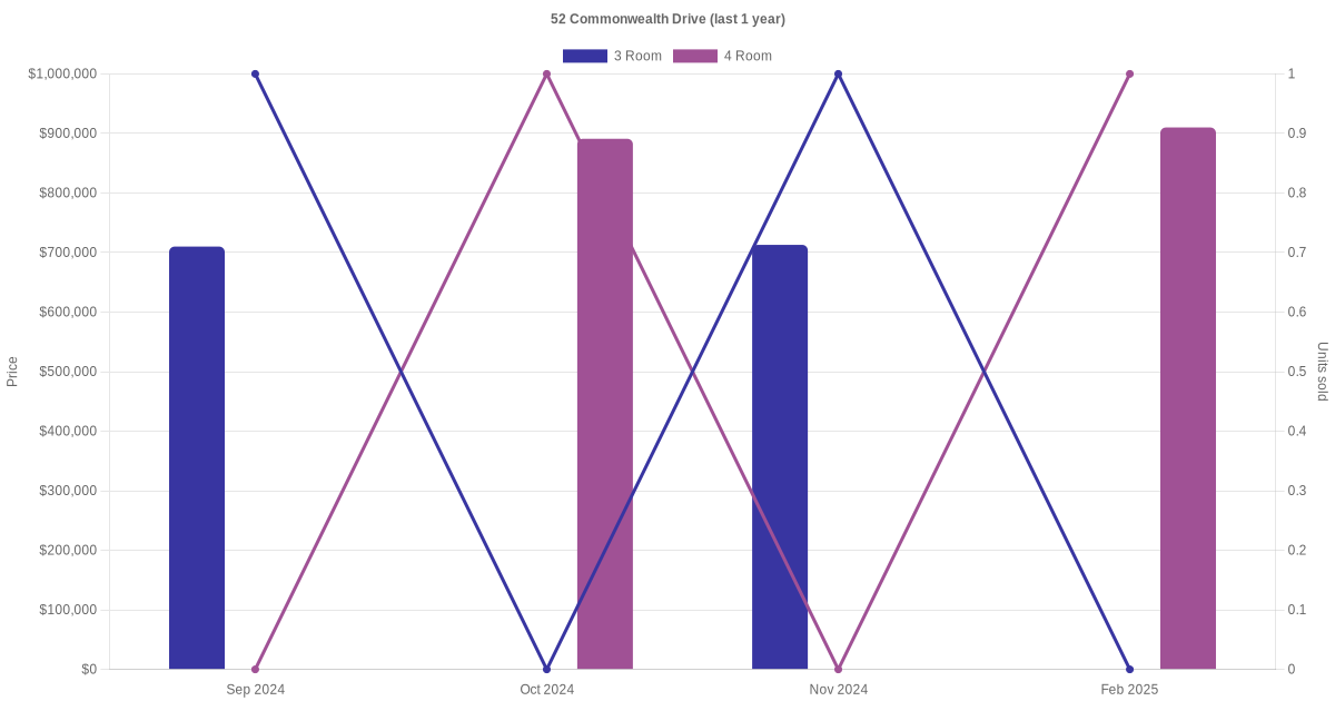 There were a total of 1 rental transactions in the last 3 years for units in block 52 Commonwealth Drive. The latest recorded one was in Mar 2024.