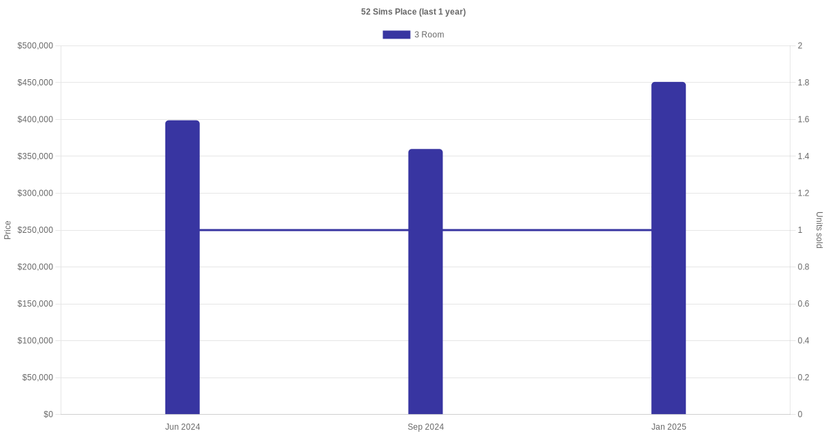 Below is a quick summary of the resale transactions volume and average price trends for the 3 room units at 52 Sims Place.