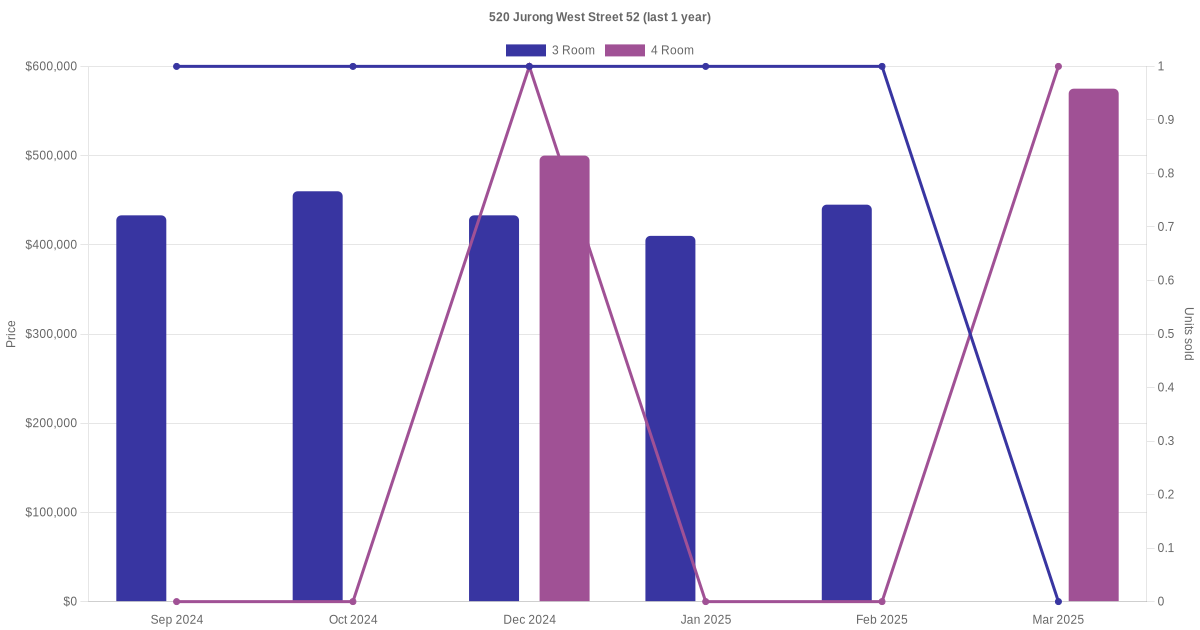 Below is a quick summary of the resale transactions volume and average price trends for the 3 room and 4 room units at 520 Jurong West Street 52.