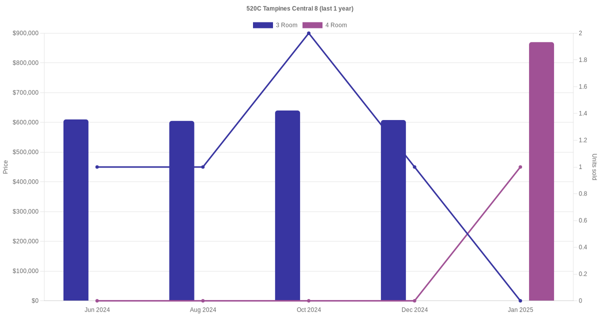 Below is a quick summary of the resale transactions volume and average price trends for the 3 room and 4 room units at 520C Tampines Central 8.
