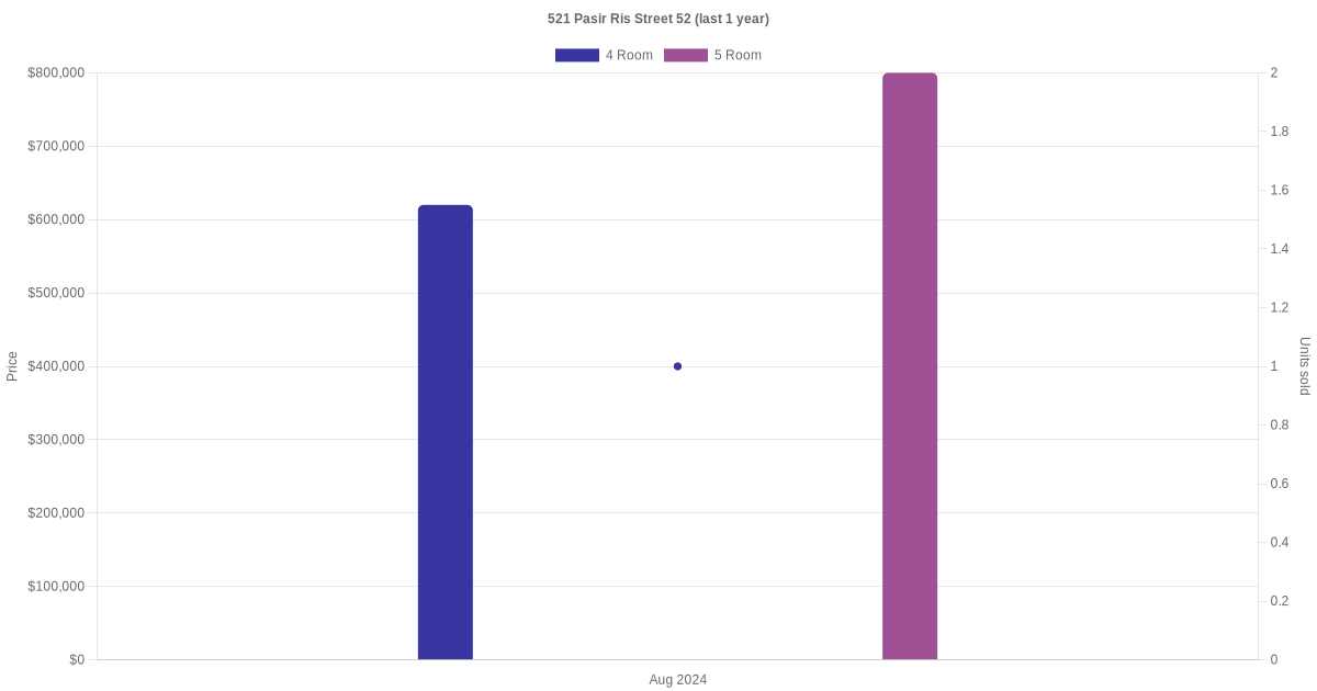 Below is a quick summary of the resale transactions volume and average price trends for the 4 room and 5 room units at 521 Pasir Ris Street 52.