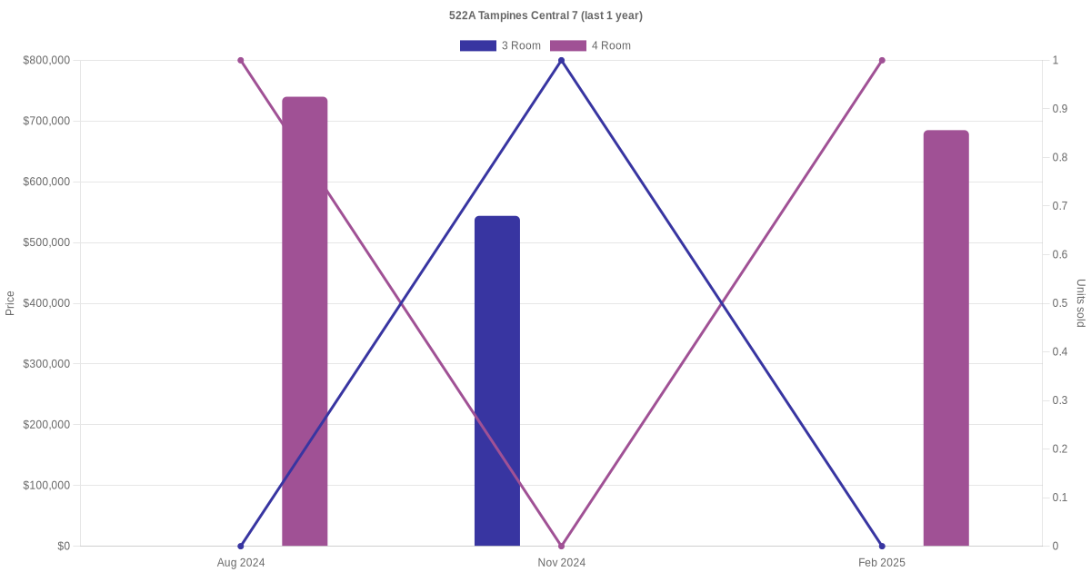 Below is a quick summary of the resale transactions volume and average price trends for the 2 room, 3 room and 4 room units at 522A Tampines Central 7.
