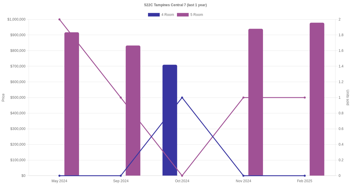 Below is a quick summary of the resale transactions volume and average price trends for the 4 room and 5 room units at 522C Tampines Central 7.