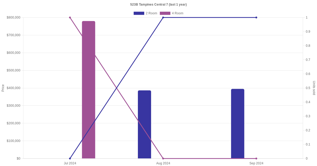 Below is a quick summary of the resale transactions volume and average price trends for the 2 room, 3 room and 4 room units at 523B Tampines Central 7.