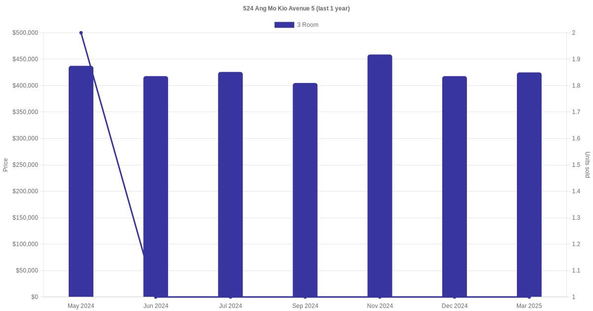 Below is a quick summary of the resale transactions volume and average price trends for the 3 room units at 524 Ang Mo Kio Avenue 5.