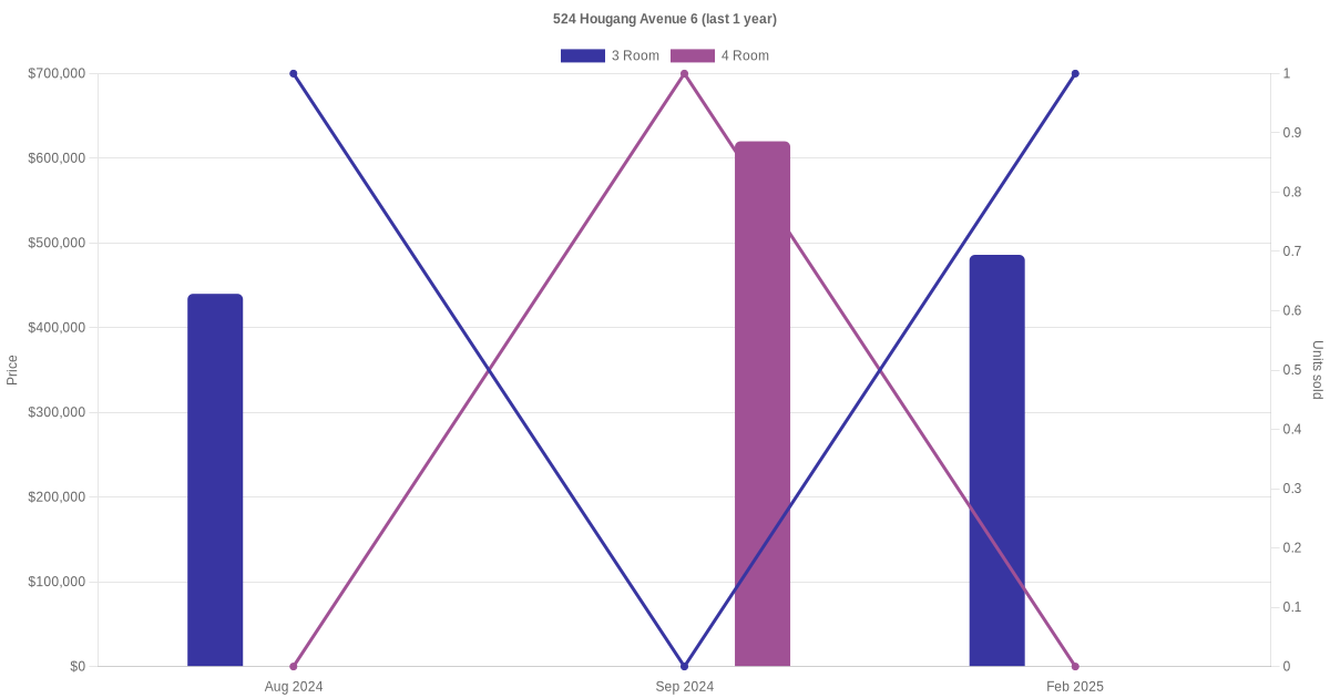 Below is a quick summary of the resale transactions volume and average price trends for the 3 room and 4 room units at 524 Hougang Avenue 6.