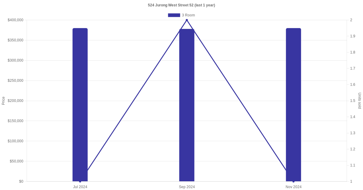Below is a quick summary of the resale transactions volume and average price trends for the 3 room and 4 room units at 524 Jurong West Street 52.