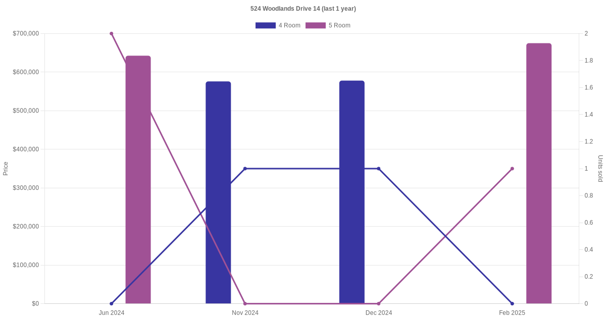 Here's a summary of the rental transactions and price trends for the 4 room and 5 room units at 524 Woodlands Drive 14.