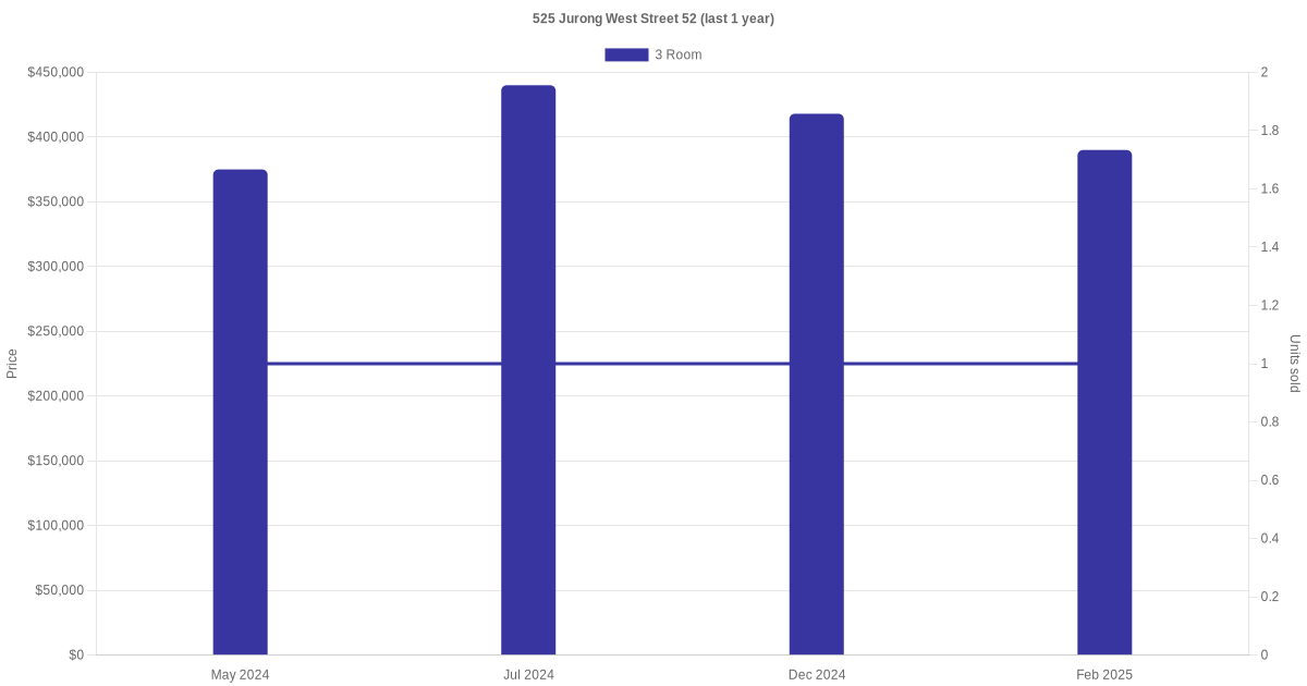 Below is a quick summary of the resale transactions volume and average price trends for the 3 room units at 525 Jurong West Street 52.