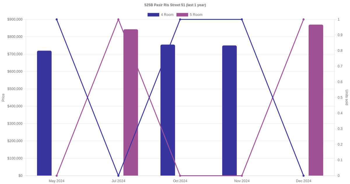 Below is a quick summary of the resale transactions volume and average price trends for the 4 room and 5 room units at 525B Pasir Ris Street 51.