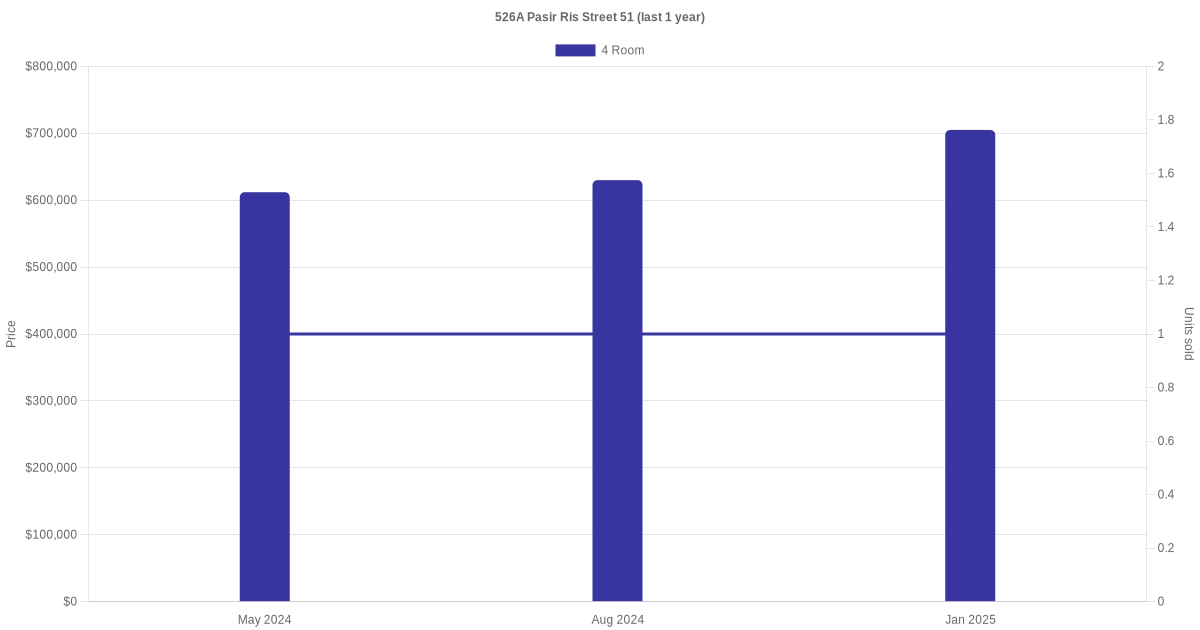 Below is a quick summary of the resale transactions volume and average price trends for the 4 room units at 526A Pasir Ris Street 51.
