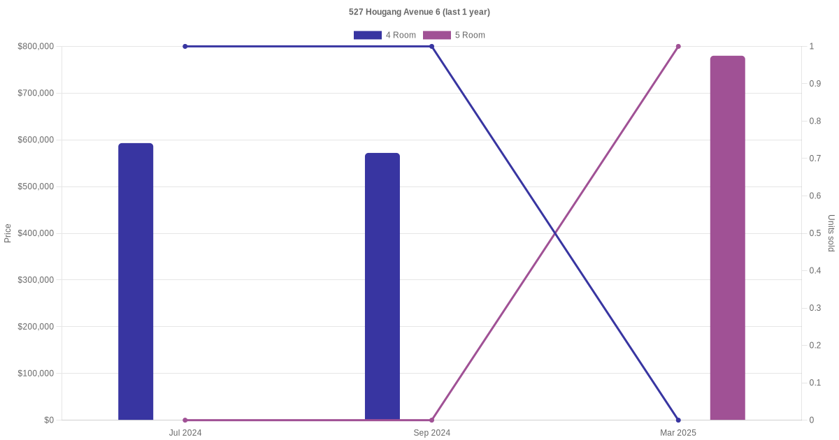 Below is a quick summary of the resale transactions volume and average price trends for the 4 room and 5 room units at 527 Hougang Avenue 6.